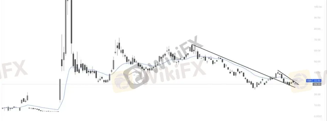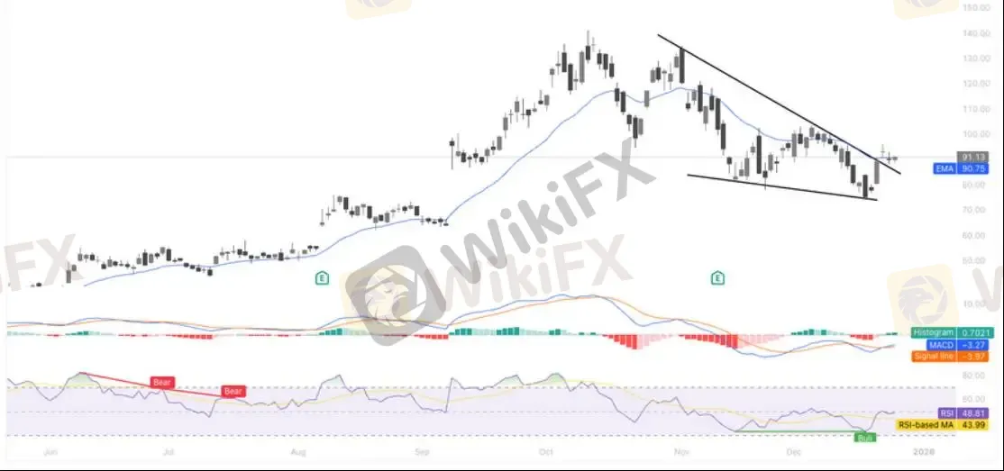 从日线结构观察,股价在前期急涨后进入下降通道整理,目前已在通道下沿附近完成回踩并企稳,价格重新贴近并反复测试 EMA,低点呈现抬升迹象;动能指标同步修复,显示看涨背离。若能继续突破12月22日高点96美元,将打开进一步上涨空间。