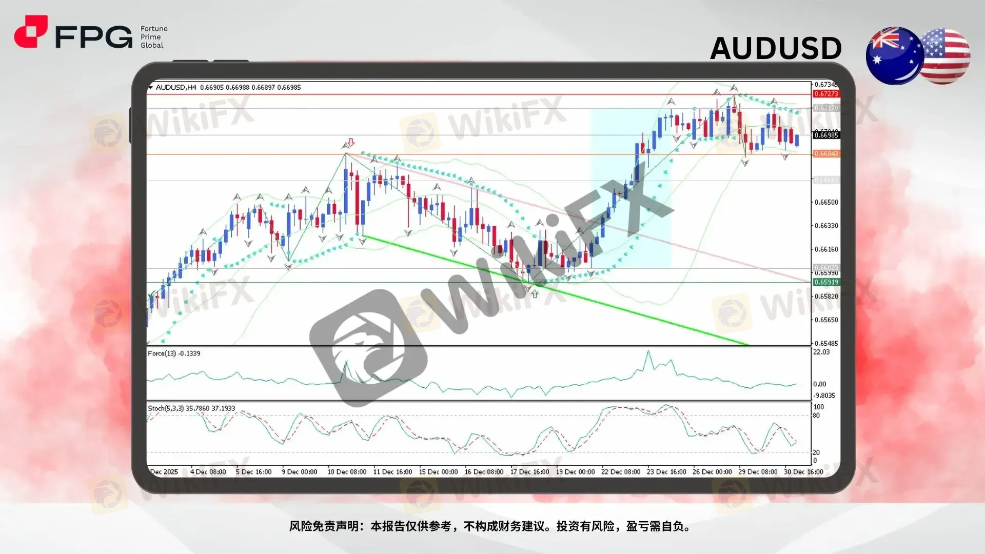 摘要:在 AUDUSD H4 图表 上,汇价在 12 月 10 日至 19 日 期间处于明显的下降通道内运行,随后价格出现清晰的趋势反转,自 0.6602 强势上涨至 0.6717。这一上涨动能伴随着对下降趋势线的有效突破,随后进入横盘整理阶段。目前价格运行于一个明确的区间结构内,上方阻力约在 0.6727,下方支撑位于 0.6684 附近。现阶段 AUDUSD 交投于 0.6698 左右,显示市场正在