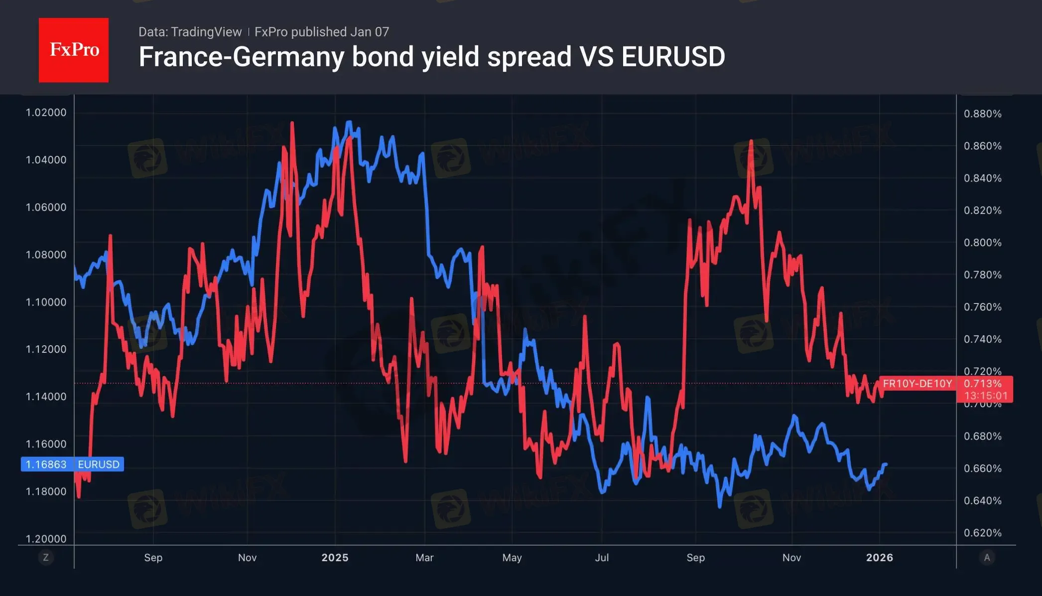 传闻时买入,事实落地后卖出。美元走强源于市场对劳动力市场数据向好的预期;美联储3月再次放宽货币政策的可能性降至45%;以及动荡局势下对避险资产的需求。唐纳德·特朗普并未排除武力夺取格陵兰岛的可能性,而丹麦及欧洲其他国家则在讨论北约解体事宜,同时美国可能掌控全球约30%的石油储备,这使其得以对市场发号施令。
