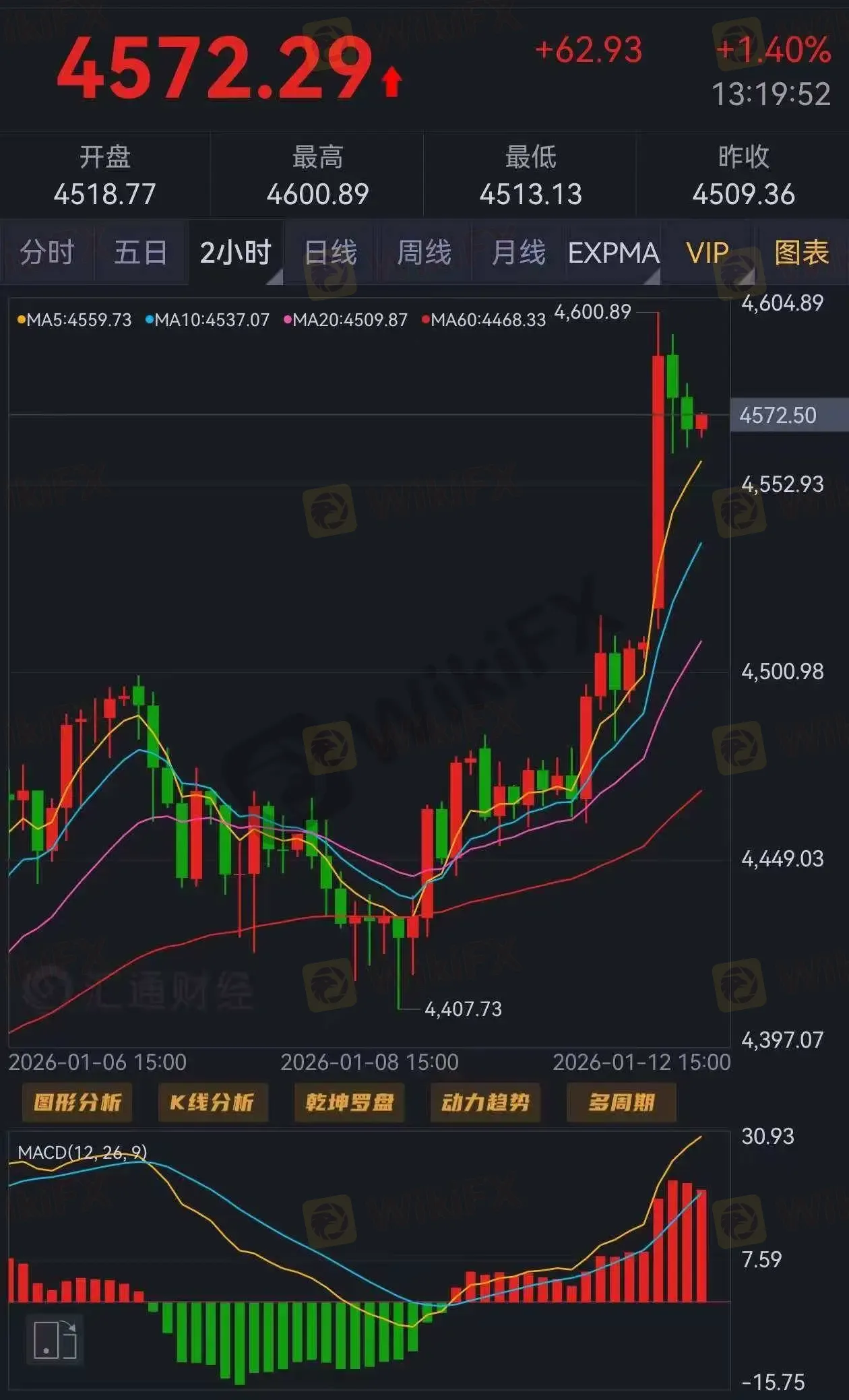 摘要:黄金价格再创历史新高。100美元的振幅成为了“新常态”。技术面,日线走势仍旧是多头排列。月线和周线走的也是非常强势。目前来看4560美元是最近的支撑,下跌只是回调,不是反转,市场技术面也没有给出任何明确的走空信号。所以,操作上,笔者首先考虑4560下方带损,分批多。若突破4580美元就加多。做多的理由太充分,太多了。或许2026春节前的金价就像2008年奥运口号描述的那样:更高、更快、更强。所以,