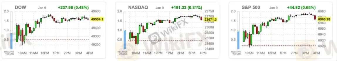 摘要:大盘回顾就业降温不衰退,指数齐创新高:CPI 与财报周成下一道关卡美股在“增长放缓但未衰退”的就业数据解读下续创历史新高。12 月非农新增仅约 5 万人、低于预期,但失业率意外降至 4.4%、薪资增速温和,强化“软着陆”叙事,风险偏好未受打击。SP 500、道指、纳指与 Russell 2000 同步走强,行情从 AI 权值股扩散至中小盘、周期与价值板块,显示多头广度改善。结构上,利率端呈现“短端
