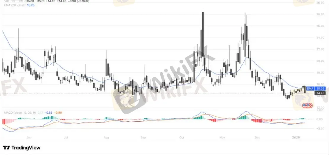 从技术面看,VIX 在前期冲高后持续回落,当前已重新压回至20日EMA附近,整体结构由“情绪冲击”转向“波动收敛”。近期低点逐步抬高,但反弹力度有限,说明恐慌情绪正在消退,而非重新酝酿新一轮系统性风险。价格运行区间明显收窄,更多体现为情绪降温后的震荡整理。