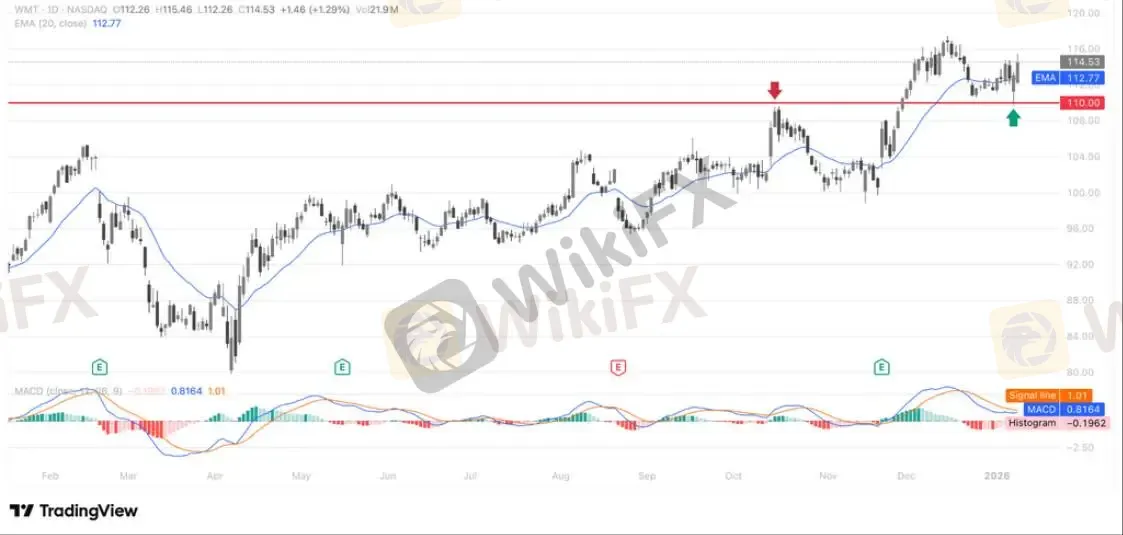 110美元完成压力转支撑,沃尔玛多头结构保持完好