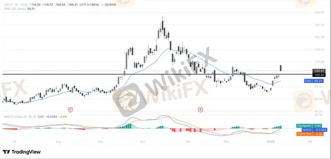 从技术面来看,OKLO 在前期大幅回落后,100美元一线成为关键结构支撑位。近期价格多次回踩该区域但未形成有效跌破,显示下方承接资金仍在,前期抛压逐步被消化。当前股价已重新站回20日EMA之上,短线结构由弱转稳,走势更偏向于下跌后的技术修复,而非延续性破位。