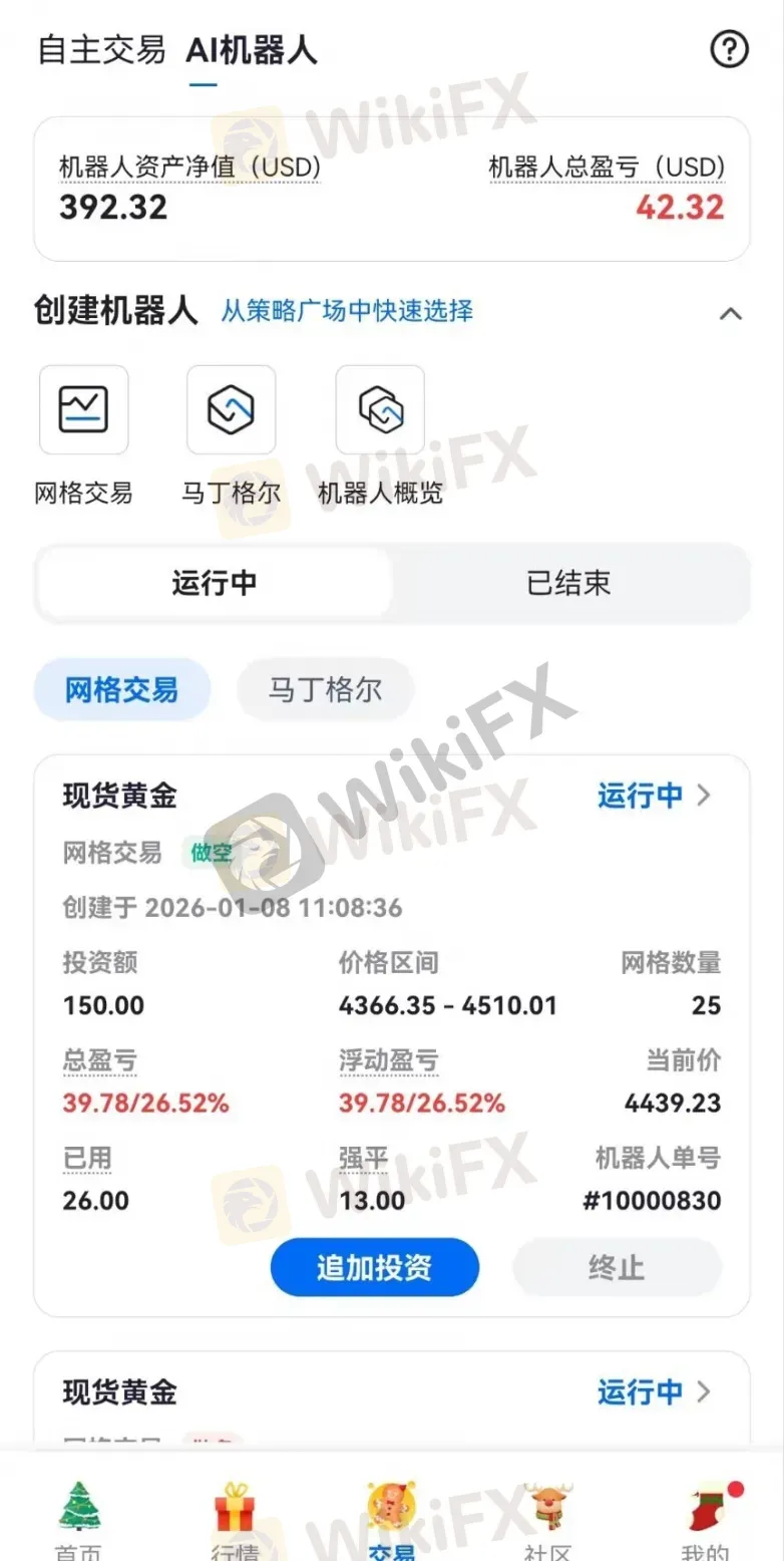 区间依赖:若黄金价格突破预设的 4366.35-4510.01 美元区间(如突发消息导致大幅跳空),机器人会停止交易,需人工调整区间后才能重启;