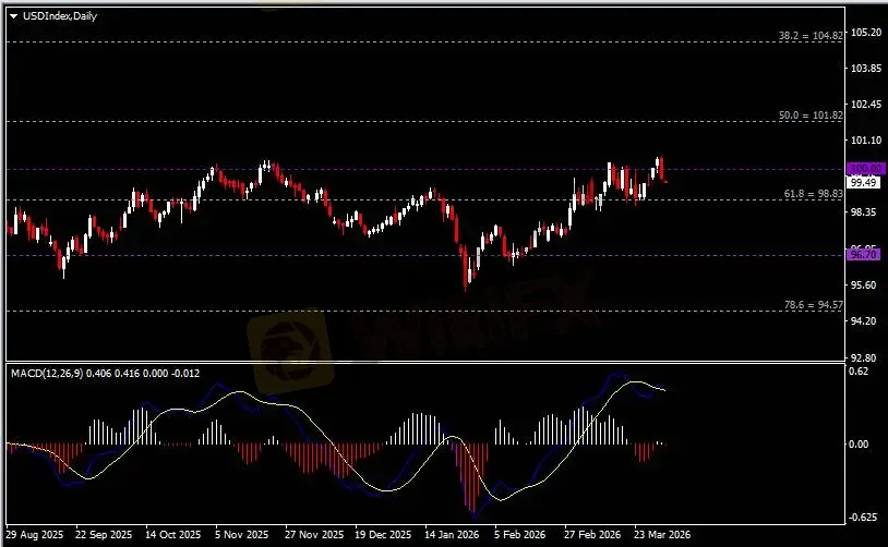 日线图显示美元指数回调下挫,当前承压于100关键阻力。从MACD来看,快慢线形成死叉,白色动能柱收缩殆尽。指数走势基本和动能柱的变化一致。