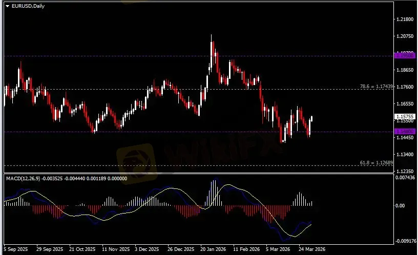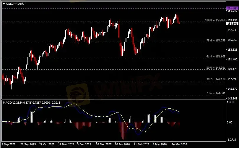 日线图显示美元兑日元高位回调,当前测试158.90支撑。从MACD来看,快慢线拐向下行,红色动能柱恢复增量。汇价走势基本和动能柱的变化一致。