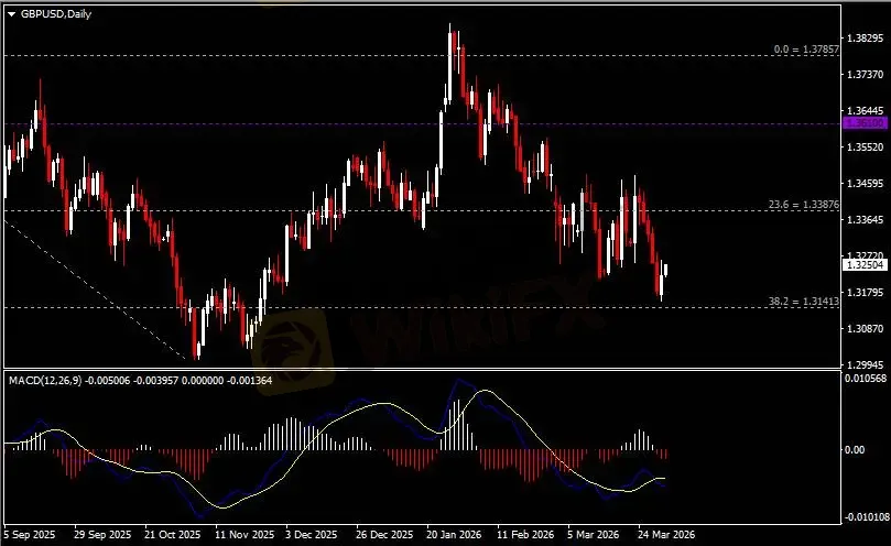 日线图显示英镑兑美元低位反弹,当前收于1.3140支撑。从MACD来看,快慢线死叉依旧,红色动能柱温和放量。汇价走势和动能柱的变化呈分歧。