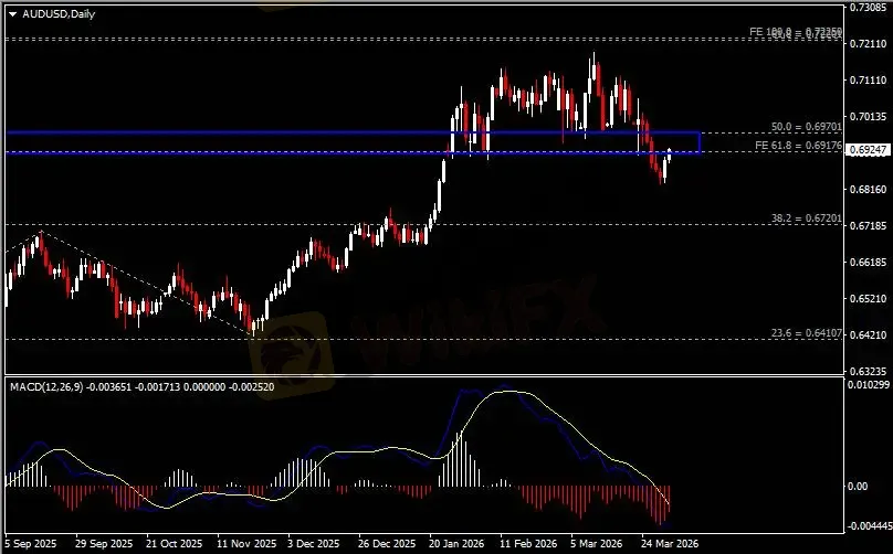 日线图显示澳元兑美元企稳反弹,当前回测0.6920-0.6970阻力区域。从MACD来看,快慢线呈拐向,红色动能柱温和收缩。汇价走势基本和动能柱的变化一致。