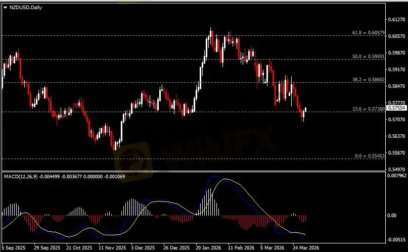 日线图显示纽元兑美元触底反弹,当前收于0.5740支撑。从MACD来看,快慢线呈拐向,红色动能柱温和收缩。汇价走势基本和动能柱的变化一致。