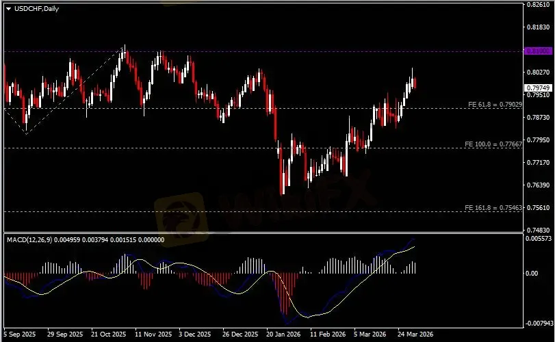 日线图显示美元兑瑞郎震荡上行,当前企稳于0.79关键支撑。从MACD来看,快慢线拐向上行,白色动能柱则温和收缩。汇价走势和动能柱的变化呈分歧。