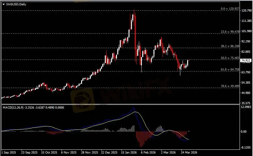 日线图显示银价反弹上行,当前测试75.50阻力。从MACD来看,快慢线形成金叉,红色动能柱收缩殆尽。银价走势基本和动能柱的变化一致。