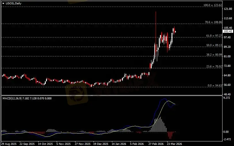 日线图显示油价高位回调,当前仍收于97.30支撑。从MACD来看,快慢线欲形成金叉,红色动能柱收缩殆尽。油价走势和动能柱的变化呈分歧。