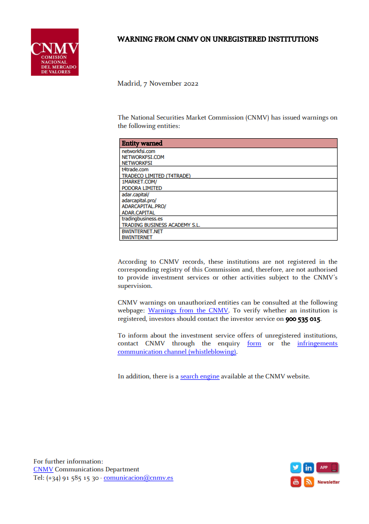 cnmv 对未注册机构的警告 马德里,2022 年 11 月 7 日 国家证券市场委员会 (cnmv) 已对以下实体发出警告: 实体警告 networkfsi.com networkfsi.com networkfsi T4Trade .com Tradeco Limited ( T4Trade ) 1MARKET .com/ podora limited adar.capital/ adarcapital.pro/ adarcapital.pro/ adar.capital tradingbusiness.es trading business academy sl bwinternet.net bwinternet 根据cnmv记录,这些机构未在本委员会相应登记处注册,因此,无权提供投资服务或其他受cnmv监管的活动。可在以下网页查阅cnmv 对未经授权实体的警告:来自cnmv 的警告。如需核实机构是否已注册,投资者应拨打900 535 015联系投资者服务部。如需了解未注册机构的投资服务报价,请通过查询表或侵权沟通渠道(举报)联系cnmv。此外,cnmv 网站上还有一个搜索引擎