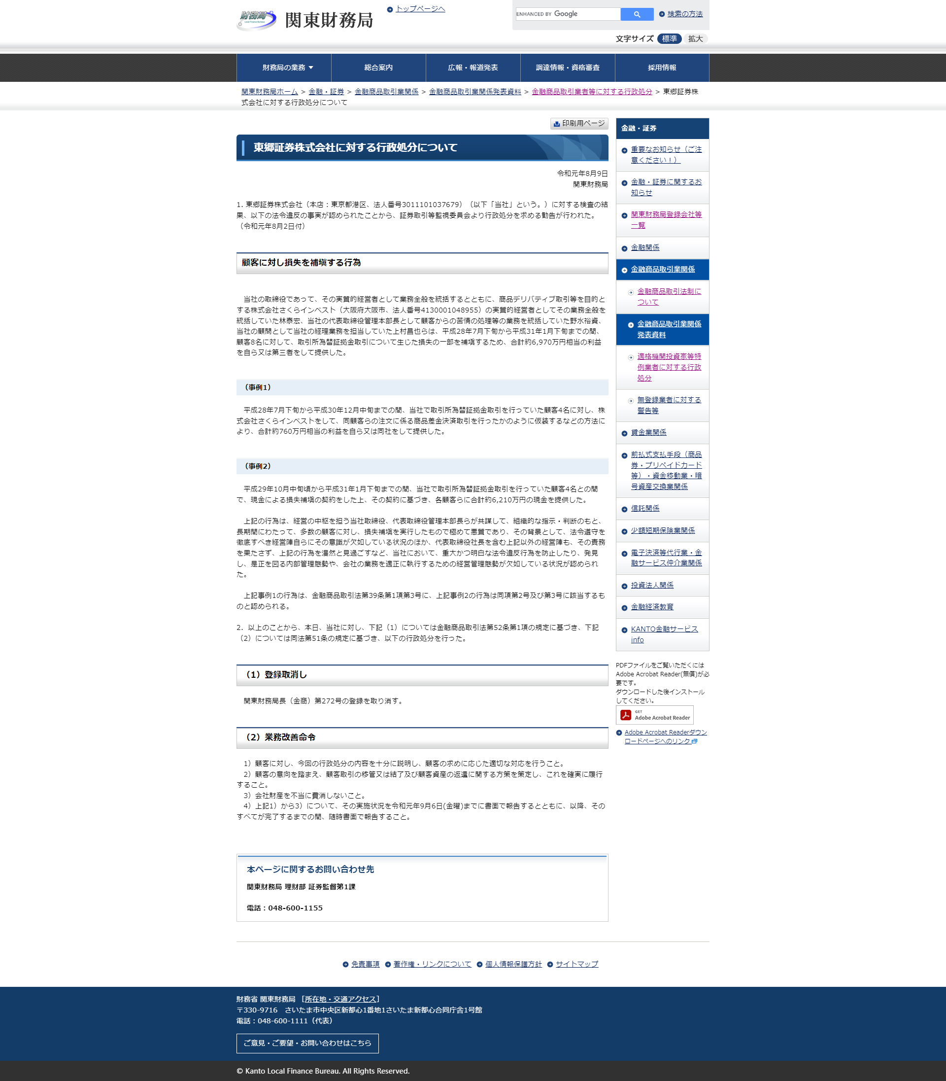 Togo对股份公司的行政诉讼 2019 年 8 月 9 日 关东地方财政局 1. Togo (总公司:东京都港区,法人编号 3011101037679)(以下简称“本公司”)(以下简称“本公司”)被认定违反了以下法律法规。提出了要求的建议。 (截至 2019 年 8 月 2 日) 赔偿客户损失的行为 Sakura Co., Ltd. 作为主要经理监督所有业务的公司董事,其目的是商品衍生品交易等。 Invest(大阪府大阪市,法人编号 4130001048955)的主要负责人,负责整体业务。本公司顾问负责会计业务的野水雄介、植村雅也等2016 年 7 月末至 2019 年 1 月末,为 8 名客户提供汇兑凭证,为弥补部分黄金交易损失,向本人或第三方提供等值利润总额约 6970 万美元日元。 (案例一)2016年7月下旬至2018年12月中旬,我们向在我司从事外汇保证金交易的4名客户提供了Sakura Invest Co., Ltd.,共提供了相当于约7.6的利润假装自己进行了与订单相关的商品差价结算交易,由本人或公司冒充百万日元。 (案例二)2017年10月中旬左右至2019年1月下旬,我们与4名在我司从事外汇保证金交易的客户签订了损失补偿合同,并根据合同向每位客户提供了一份总计约6210万日元现金。在上述行为中,本公司负责经营核心的董事与行政部代表董事、总经理在系统性指示下,长期合谋为大量客户赔偿损失,这是极恶的,其背景是管理团队本身缺乏严格遵守法律法规的意识,我公司缺乏内部控制制度来预防、发现和纠正严重和明显的违规行为法律法规,以及正确执行公司业务的业务管理制度,例如盲目忽视上述行为。前例一之行为,视为属于金融商品交易法第三十九条第一项第三款,以上第二例之行为,视为属于同项第二款及第三款。 2.综上所述,今天,根据金融商品交易法第 52 条第 1 项的规定,我们要求以下 (1) 以及根据该法第 51 条的规定进行以下 (2):采取了行政措施。 (1)注销关东地方财政局局长(Kinsho)第272号的注册被取消。 (2) 业务改善令 1) 向客户充分说明本行政行为的内容,并根据客户的要求采取适当的措施。 2)根据客户的意愿,制定客户交易的转让或终止以及客户资产返还的政策,并严格执行。 3) 不要不公平地花费公司资产。 4)在2019年9月6日星期五之前以书面形式报告上述1)至3)的实施情况,然后随时以书面形式报告,直至全部完成。