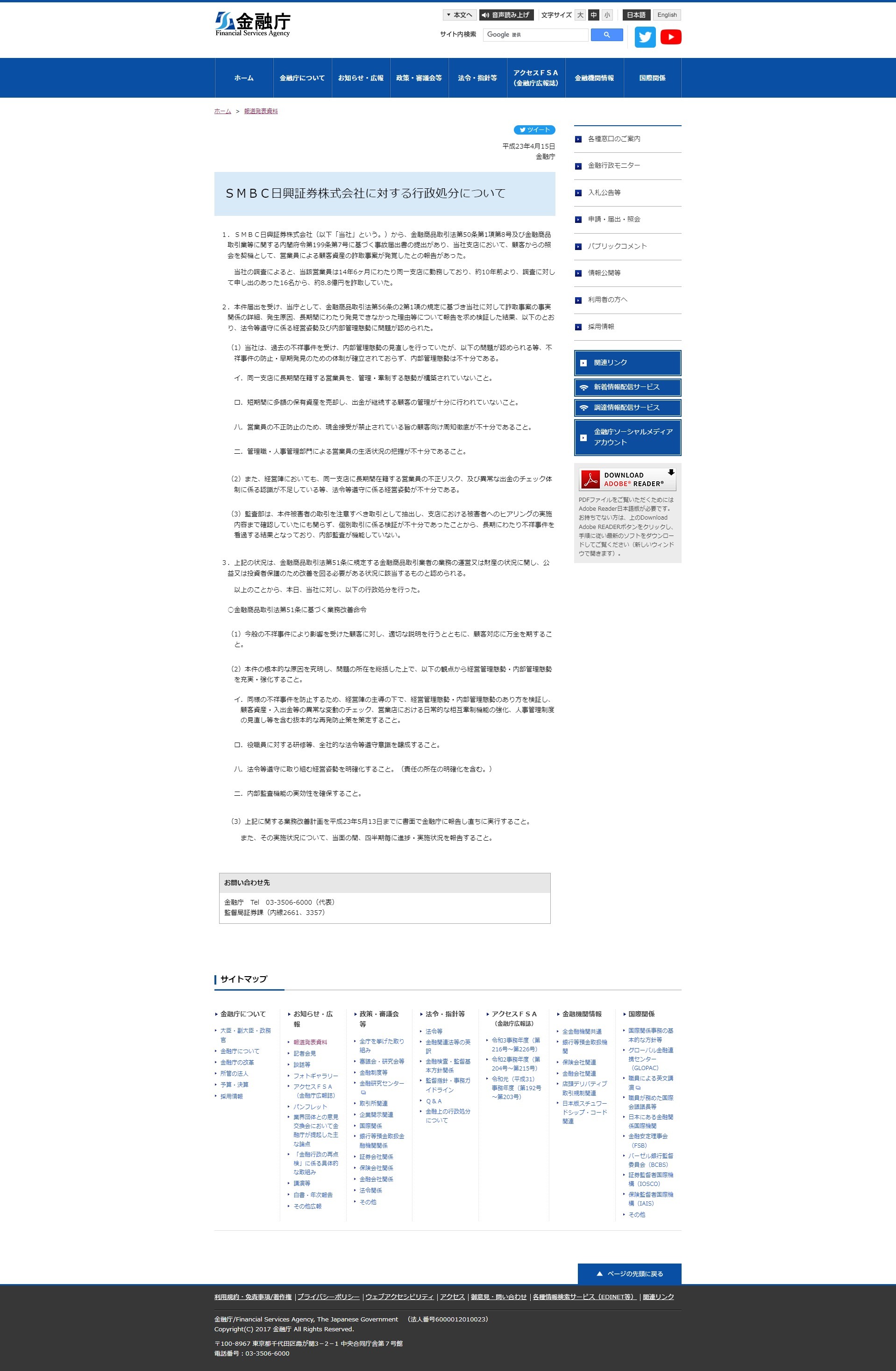 2011 年 4 月 15 日金融厅 SMBC Nikko对股份公司的行政行为 1. SMBC Nikko某股份公司(以下简称“本公司”)依据金融商品交易法第50条第1项第8项及内阁府条例第199条第7项《金融商品业务》提交事故申报书等,在公司某分行,接到客户询问后发现了一起业务员诈骗客户资产的案件。根据我们的调查,该营业员在同一家分行工作了 14 年零 6 个月,从大约 10 年前开始,从提交调查提案的 16 人那里骗取了约 8.8 亿日元。 2.金管局针对该报告,根据第56条的规定,向本公司通报了欺诈案件的详细事实、发生的原因以及长时间未能被发现的原因—— 2 金融商品交易法第1项 经要求和核实报告,发现在遵守法律法规方面的经营态度和内部控制系统存在以下问题。 (1)针对以往的丑闻,公司对内部控制制度进行了检讨,发现存在以下问题,尚未建立预防和早期发现丑闻的制度,内部控制制度不完善。胃。对长期在同一网点工作的销售人员缺乏管理和考核制度。 B.对短时间内卖出大量资产并持续回笼资金的客户管理不到位。 C。为防止销售人员欺诈而禁止接受现金,与客户的沟通不充分。 D.管理人员和人事管理部门对销售人员的生活状况了解不够。 (2) 此外,管理团队也缺乏对长期在同一分支机构工作的销售人员的欺诈风险的认识,以及检查异常提款的系统,这就够了。 (3)虽然审计部认定受害人的交易需要谨慎,并确认了分行约谈受害人的细节,但对个别交易的核实不充分,导致丑闻长期被忽视,并且内部审计没有运作。 3.上述情况被视为金融商品交易法第51条规定的金融商品经营者的经营活动或财产状况,为了公共利益或保护投资者需要改善的情况。基于上述情况,今天对公司采取了以下行政措施。 ○ 根据金融商品交易法第 51 条的业务改善命令 (1) 向受此丑闻影响的客户提供适当的解释,并采取一切可能的措施应对客户。 (二)追究本次事件的根源,总结问题定位,从以下几个方面完善和加强业务管理制度和内部控制制度。胃。为防止类似丑闻发生,在管理团队的领导下,我们将核查业务管理制度和内部控制制度的状态,检查客户资产、存取款等异常波动情况,并在日常互动中制定严厉的措施防止再次发生,包括加强制衡和审查人事管理制度。 B.培养全公司遵守法律法规的意识,例如对管理人员和员工进行培训。 C。明确遵纪守法的经营理念。 (包括澄清责任所在。) D.确保内部审计职能的有效性。 (3) 于2011 年5 月13 日前,将上述业务改善计划以书面形式报请金融厅,并立即实施。此外,暂按季度报告执行进度和情况。