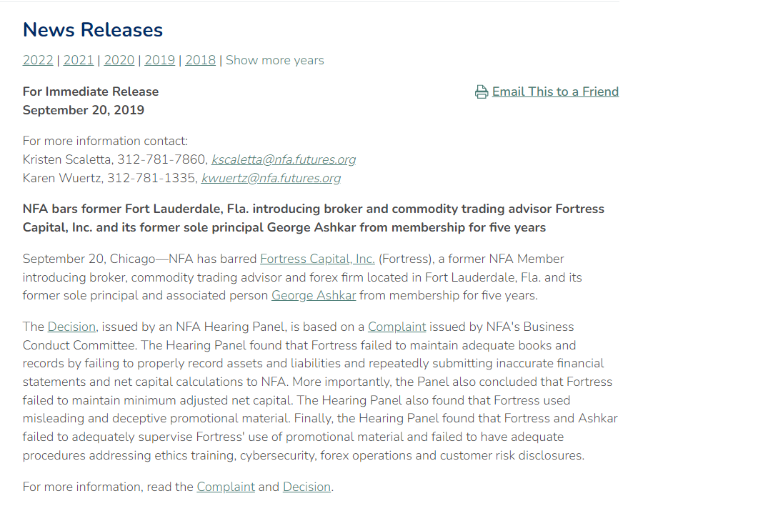 NFA 禁止前佛罗里达州劳德代尔堡介绍经纪人和商品交易顾问 Fortress Capital, Inc. 及其前唯一负责人 George Ashkar 成为会员五年