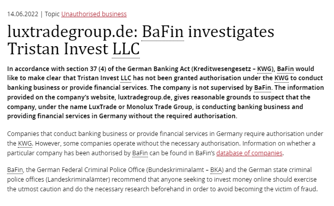 2022 年 6 月 14 日 |主题未经授权的业务 luxtradegroup.de:bafin 调查 Tristan Invest LLC根据德国银行法 (kreditwesengesetz – kwg) 第 37 (4) 条,联邦金融监管局明确表示 Tristan Invest LLC未获 kwg 授权开展银行业务或提供金融服务。该公司不受bafin监管。公司网站 luxtradegroup.de 上提供的信息提供了合理的理由怀疑公司以 luxtrade 的名义或 Monolux Trade Group, 未经授权在德国开展银行业务和提供金融服务。在德国开展银行业务或提供金融服务的公司需要获得 kwg 的授权。然而,一些公司在没有必要授权的情况下运营。有关特定公司是否已获得 bafin 授权的信息可以在 bafin 的公司数据库中找到。 bafin、德国联邦刑事警察局 (bundeskriminalamt – bka) 和德国国家刑事警察局 (landeskriminalämter) 建议,任何寻求在线投资的人都应谨慎行事并事先进行必要的研究,以避免成为受害者欺诈罪。