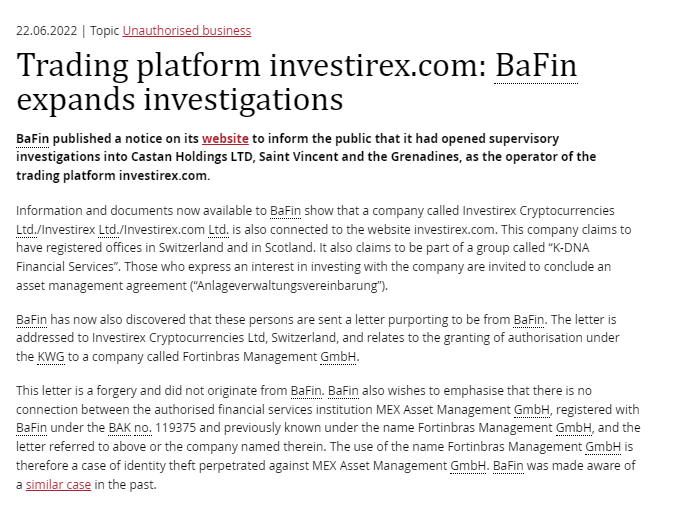 2022 年 6 月 22 日 |话题未经授权的商业交易平台 Investirex.com:bafin扩大调查 bafin在其网站上发布公告,告知公众其已对圣文森特和格林纳丁斯的castan holdings ltd作为交易平台的运营商展开监管调查 Investirex.com。 bafin 现在可获得的信息和文件显示,一家名为 Investirex加密货币有限公司/ Investirex有限公司/ Investirex .com有限公司也连接到网站 Investirex.com。该公司声称在瑞士和苏格兰设有注册办事处。它还声称自己是一个名为“k-dna 金融服务”的组织的一部分。那些表示有兴趣与公司投资的人被邀请签订资产管理协议(“anlageverwaltungsvereinbarung”)。 bafin 现在还发现这些人收到了一封声称来自bafin 的信。这封信是写给 Investirex加密货币有限公司,瑞士,并涉及根据 kwg 向一家名为 fortinbras management gmbh 的公司授予授权。这封信是伪造的,并非来自 bafin。 bafin 还希望强调,授权金融服务机构 mex asset management gmbh 与在 bafin 注册的 bak no. 之间没有任何联系。 119375,以前以 fortinbras management gmbh 的名义为人所知,以及上面提到的字母或其中指定的公司。因此,使用 fortinbras management gmbh 这个名称是针对 mex asset management gmbh 的身份盗窃案。 bafin 过去曾获悉类似案例。