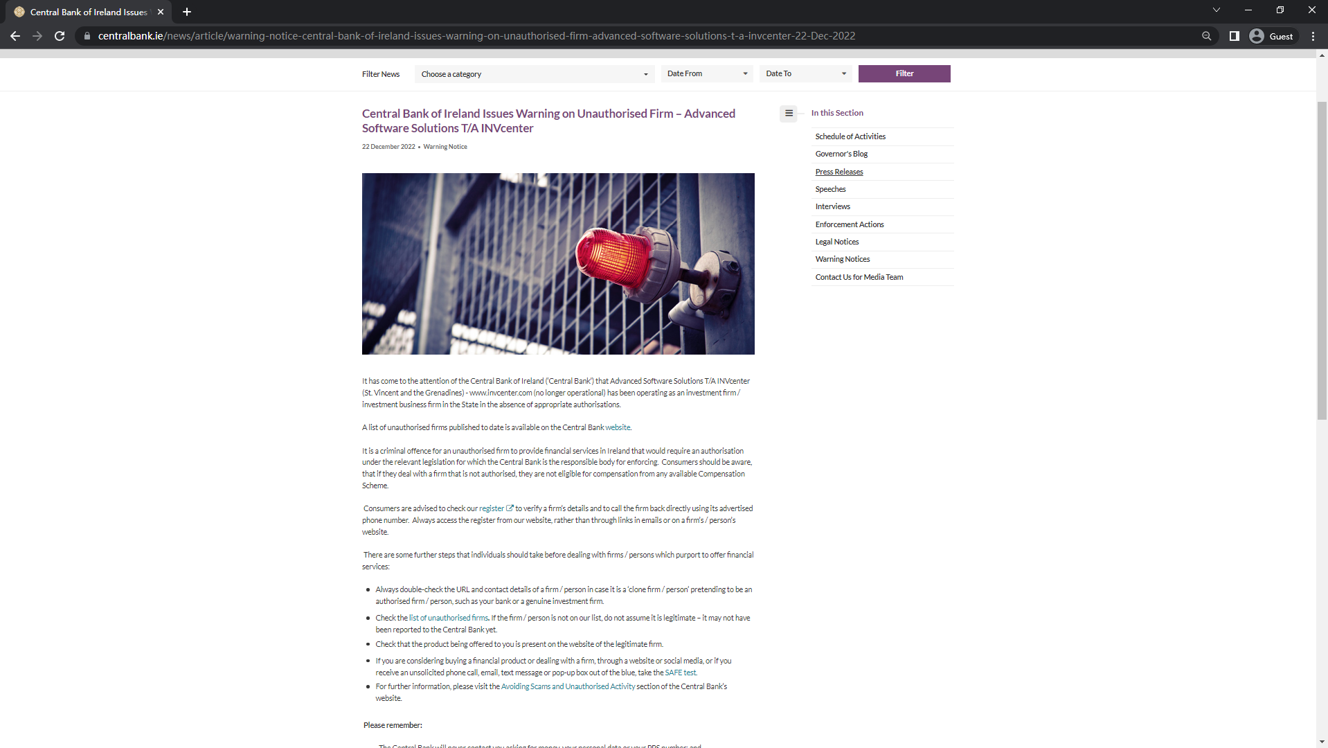 爱尔兰中央银行对未经授权的公司发出警告——高级软件解决方案 T/A INVcenter