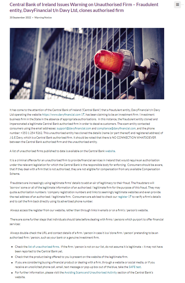 爱尔兰中央银行对未经授权的公司发出警告——欺诈实体 DavyFinancial t/n Davy Ltd,克隆授权公司