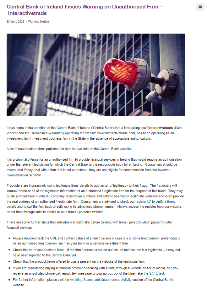 2022 年 6 月 28 日警告通知警告,爱尔兰中央银行(“中央银行”)注意到一家自称是 interactivetrade(圣文森特和格林纳丁斯)——以前经营网站 www. interactivetrade .com,在没有适当授权的情况下一直在该州作为投资公司/投资业务公司运营。迄今为止公布的未经授权公司名单可在中央银行网站上查阅。根据中央银行负责执行的相关立法,未经授权的公司在爱尔兰提供需要获得授权的金融服务属于刑事犯罪。消费者应该知道,如果他们与未经授权的公司打交道,他们就没有资格从投资者补偿计划中获得补偿。欺诈者越来越多地使用合法公司的详细信息来为他们的欺诈行为增添合法性。欺诈者将出于此欺诈目的“借用”授权/合法公司的部分或全部合法信息。他们可能会引用授权号/公司注册号和看似合法网站的链接,甚至提供授权/合法公司的真实地址。建议消费者检查我们的登记册以验证公司的详细信息,并使用其广告电话号码直接给公司回电。始终从我们的网站访问注册表,而不是通过电子邮件或公司/个人网站上的链接。在与声称提供金融服务的公司/个人打交道之前,个人应该采取一些进一步的步骤:始终仔细检查公司/个人的 URL 和联系方式,以防它是假装的“克隆公司/个人”授权公司/个人,例如您的银行或真正的投资公司。检查未经授权的公司名单。如果公司/个人不在我们的名单上,请不要认为它是合法的——它可能还没有报告给中央银行。检查提供给您的产品是否出现在合法公司的网站上。如果您正在考虑通过网站或社交媒体购买金融产品或与公司打交道,或者如果您突然收到未经请求的电话、电子邮件、短信或弹出框,请参加安全测试。如需更多信息,请访问中央银行网站的避免诈骗和未经授权的活动部分。请记住:- 中央银行绝不会联系您索取金钱、您的个人数据或您的 PPS 号码;并且 - 如果向您提供的东西好得令人难以置信,那很可能是骗局。任何希望就此类公司/个人的信息联系中央银行的人都可以致电 (01) 224 4000。公众也可以使用此热线查询公司是否获得授权。