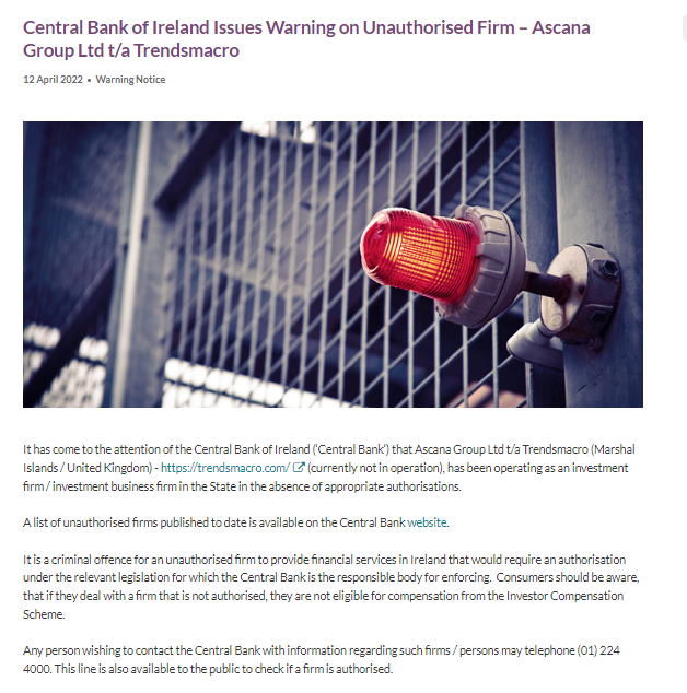 2022 年 4 月 12 日警告通知警告,爱尔兰中央银行(“中央银行”)已经注意到 Ascana Group Ltd吨/吨 TRENDSMACRO(元帅群岛/英国)- https:// TRENDSMACRO .com/(目前未运营),在没有适当授权的情况下一直在该州作为投资公司/投资业务公司运营。迄今为止公布的未经授权公司名单可在中央银行网站上查阅。根据中央银行负责执行的相关立法,未经授权的公司在爱尔兰提供需要获得授权的金融服务属于刑事犯罪。消费者应该知道,如果他们与未经授权的公司打交道,他们就没有资格从投资者补偿计划中获得补偿。任何希望就此类公司/个人的信息联系中央银行的人都可以致电 (01) 224 4000。公众也可以使用此热线查询公司是否获得授权。