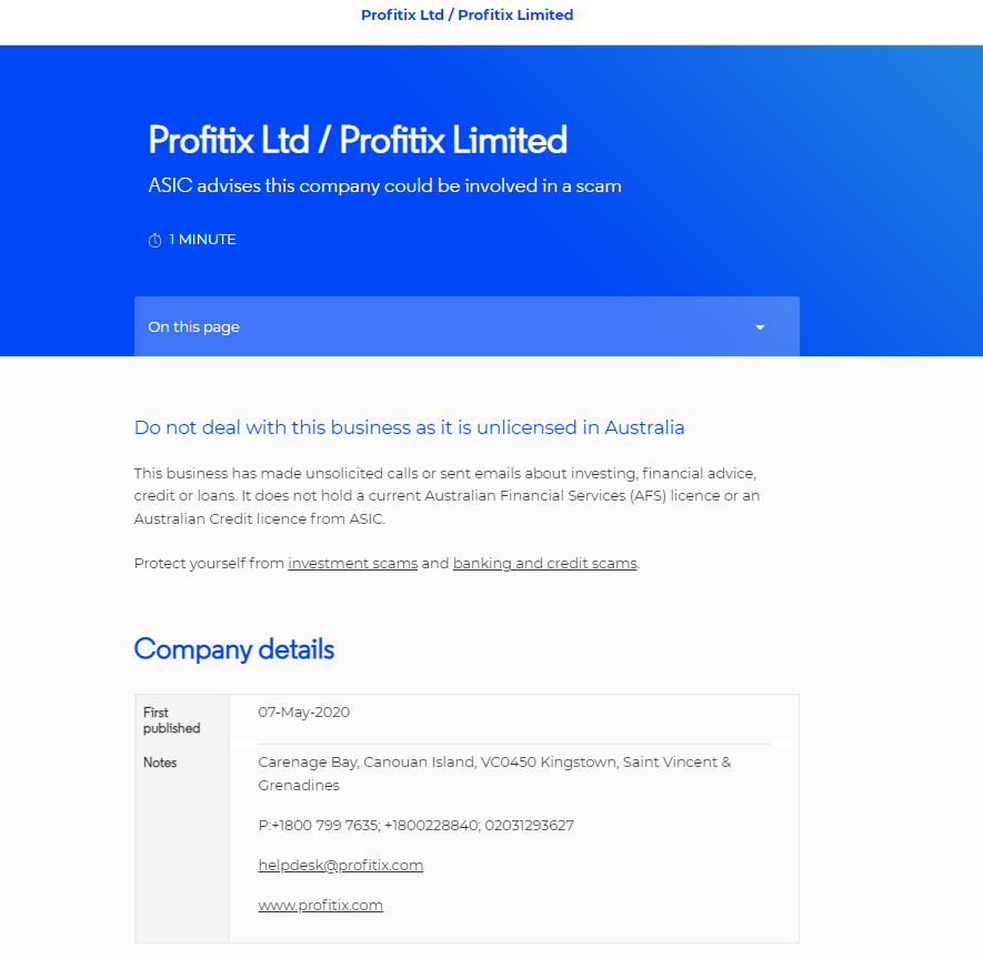 PROFITIX有限公司 / PROFITIX limited asic advises this company could be involved in a scam page reading time:1 minute on this page do not deal with this business as it is unlicensed in Australia 这家公司主动打电话或发送有关投资、财务建议、信贷或贷款的电子邮件.它不持有当前的澳大利亚金融服务 (afs) 许可证或 asic 的澳大利亚信贷许可证。保护自己免受投资诈骗以及银行和信贷诈骗。公司详细信息首次发布于 2020 年 5 月 7 日笔记 Carenage Bay, Canouan island, vc0450 kingstown, saint vincent & grenadines p:+1800 799 7635; +1800228840; 02031293627 服务台@ PROFITIX .com 万维网。 PROFITIX .com