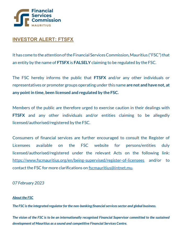 投资者警示: FTSFX毛里求斯金融服务委员会 (“fsc”) 注意到一个名为 FTSFX谎称受 fsc 监管。 fsc特此通知公众 FTSFX和/或以该名称运营的任何其他个人或代表或发起人团体在任何时候都没有也没有获得 fsc 的许可和监管。因此,呼吁公众在与他人打交道时谨慎行事 FTSFX以及声称据称已获得 fsc 许可/授权/注册的任何其他个人和/或实体。进一步鼓励金融服务的消费者查阅 fsc 网站上提供的被许可人登记册,了解根据相关法案在以下链接上获得正式许可/授权/注册的个人/实体:https://www.fscmauritius.org/en/being - 受监督/许可注册和/或联系 fsc 以获取更多说明,地址为 fscmauritius@intnet.mu。 2023 年 2 月 7 日 关于 fsc fsc 是非银行金融服务部门和全球业务的综合监管机构。 fsc 的愿景是成为国际公认的金融监管机构,致力于毛里求斯的持续发展,使其成为一个稳健且具有竞争力的金融服务中心。在履行其使命时,fsc旨在促进毛里求斯金融机构和资本市场的发展、公平、效率和透明度;打击犯罪和不当行为,以保护投资于非银行金融产品的公众;确保毛里求斯金融体系的健全和稳定。