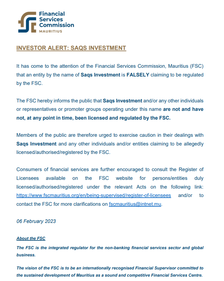 投资者警示: Saqs Investment毛里求斯金融服务委员会 (fsc) 注意到一个名为 Saqs Investment谎称受 fsc 监管。 fsc特此通知公众 Saqs Investment和/或以该名称运营的任何其他个人或代表或发起人团体在任何时候都没有也没有获得 fsc 的许可和监管。因此,呼吁公众在与他人打交道时谨慎行事 Saqs Investment以及声称据称已获得 fsc 许可/授权/注册的任何其他个人和/或实体。进一步鼓励金融服务的消费者查阅 fsc 网站上提供的被许可人登记册,了解根据相关法案在以下链接上获得正式许可/授权/注册的个人/实体:https://www.fscmauritius.org/en/being - 受监督/许可注册和/或联系 fsc 以获取更多说明,地址为 fscmauritius@intnet.mu。 2023 年 2 月 6 日