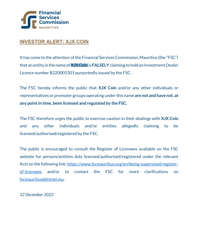 投资者警示: XJX Coin毛里求斯金融服务委员会(“fsc”)注意到,一个以 XJX Coin谎称持有据称由 fsc 颁发的投资交易商执照编号 b220005301。 fsc特此通知公众 XJX Coin和/或以该名称运营的任何其他个人或代表或发起人团体在任何时候都没有也没有获得 fsc 的许可和监管。因此,FSC 敦促公众在处理与 XJX Coin以及据称声称获得 fsc 许可/授权/注册的任何其他个人和/或实体。鼓励公众查阅 fsc 网站上的持证人登记册,了解根据相关法案获得正式许可/授权/注册的个人/实体,链接如下:https://www.fscmauritius.org/en/being-supervised/在 fscmauritius@intnet.mu 上注册被许可人和/或联系 fsc 以获得更多说明。 2022 年 12 月 12 日