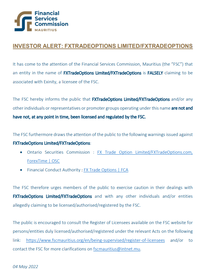 投资者警示: FxTradeOptions有限的/ FxTradeOptions毛里求斯金融服务委员会(“fsc”)注意到,一个以 FxTradeOptions有限的/ FxTradeOptions谎称与 exinity 有关联,exinity 是 fsc 的被许可人。 fsc特此通知公众 FxTradeOptions有限的/ FxTradeOptions和/或以该名称运营的任何其他个人或代表或发起人团体在任何时候都没有也没有获得 fsc 的许可和监管。 FSC 还提请公众注意以下警告: FxTradeOptions有限的/ FxTradeOptions : 安大略省证券委员会 : fx trade option limited/ FxTradeOptions .com, 外汇时间 | osc 金融行为监管局:外汇交易期权 |因此,fca fsc 敦促公众在处理与 FxTradeOptions有限的/ FxTradeOptions以及据称声称获得 fsc 许可/授权/注册的任何其他个人和/或实体。鼓励公众查阅 fsc 网站上的持证人登记册,了解根据相关法案获得正式许可/授权/注册的个人/实体,链接如下:https://www.fscmauritius.org/en/being-supervised/许可证注册人和/或联系 fsc 以获取更多说明,请发送电子邮件至 fscmauritius@intnet.mu。 2022 年 5 月 4 日