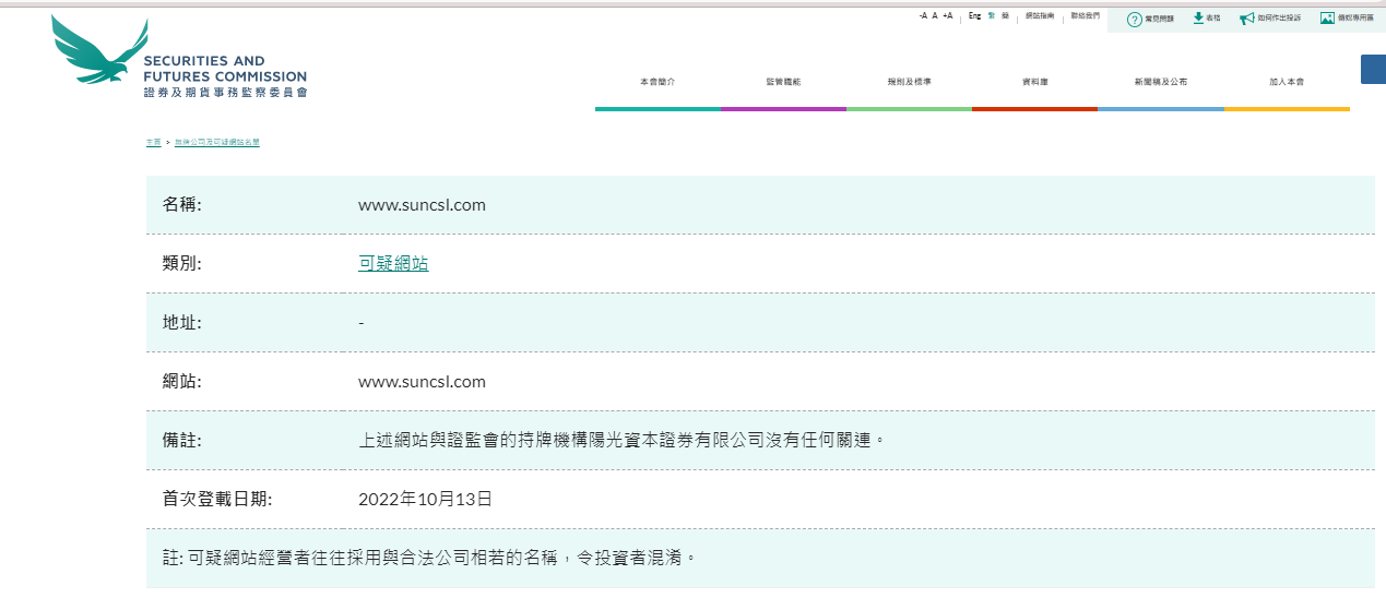 名称: www.suncsl.com 类别: 可疑网站地址: - 网站: www.suncsl.com 备注: 上述网站与证监会的持牌机构阳光资本证券有限公司没有任何关连。首次登载日期: 2022年10月13日注: 可疑网站经营者往往采用与合法公司相若的名称,令投资者混淆。无牌公司及可疑网站名单列出了没有在香港领取牌照,并引起了证监会关注的公司。这些公司被怀疑现正或曾经以香港投资者为推销对象,又或声称与香港有联系。你可按名称或类别进行搜寻,以查证某公司是否已列入名单内。此名单并非详尽无遗。由于证监会经常都会发现一些值得注意的公司或网站, 因此我们会不时在名单内加入新的名称。若你曾经被无牌公司接触,请利用我们的网上投诉表格。有关锅炉室,欺诈网站和伪冒电邮的进一步资料,请按相关连结。注:无牌公司及可疑网站名单旨在及早向投资者发出警报。投资者不能只依赖上述名单的资料,他们需自行审慎查核个别公司的详情。请选取各栏内容名称的首个英文字母以取览名单,或点击“中文名称”栏目浏览只具中文名称的公司。 "