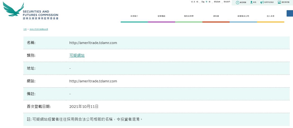 名称: http://ameritrade.tdamr.com 类别: 可疑网站地址: - 网站: http://ameritrade.tdamr.com 备注: - 首次登载日期: 2021年10月11日注: 可疑网站经营者往往采用与合法公司相若的名称,令投资者混淆。无牌公司及可疑网站名单列出了没有在香港领取牌照,并引起了证监会关注的公司。这些公司被怀疑现正或曾经以香港投资者为推销对象,又或声称与香港有联系。你可按名称或类别进行搜寻,以查证某公司是否已列入名单内。此名单并非详尽无遗。由于证监会经常都会发现一些值得注意的公司或网站, 因此我们会不时在名单内加入新的名称。若你曾经被无牌公司接触,请利用我们的网上投诉表格。有关锅炉室,欺诈网站和伪冒电邮的进一步资料,请按相关连结。注:无牌公司及可疑网站名单旨在及早向投资者发出警报。投资者不能只依赖上述名单的资料,他们需自行审慎查核个别公司的详情。请选取各栏内容名称的首个英文字母以取览名单,或点击“中文名称”栏目浏览只具中文名称的公司。 "