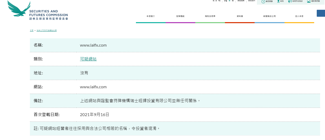 名称: www.lalfx.com 类别: 可疑网站地址: 没有网站: www.lalfx.com 备注: 上述网站与证监会持牌机构 瑞士经纬投资有限公司并无任何关系。首次登载日期: 2021年9月16日注: 可疑网站经营者往往采用与合法公司相若的名称,令投资者混淆。无牌公司及可疑网站名单列出了没有在香港领取牌照,并引起了证监会关注的公司。这些公司被怀疑现正或曾经以香港投资者为推销对象,又或声称与香港有联系。你可按名称或类别进行搜寻,以查证某公司是否已列入名单内。此名单并非详尽无遗。由于证监会经常都会发现一些值得注意的公司或网站, 因此我们会不时在名单内加入新的名称。若你曾经被无牌公司接触,请利用我们的网上投诉表格。有关锅炉室,欺诈网站和伪冒电邮的进一步资料,请按相关连结。注:无牌公司及可疑网站名单旨在及早向投资者发出警报。投资者不能只依赖上述名单的资料,他们需自行审慎查核个别公司的详情。请选取各栏内容名称的首个英文字母以取览名单,或点击“中文名称”栏目浏览只具中文名称的公司。 "