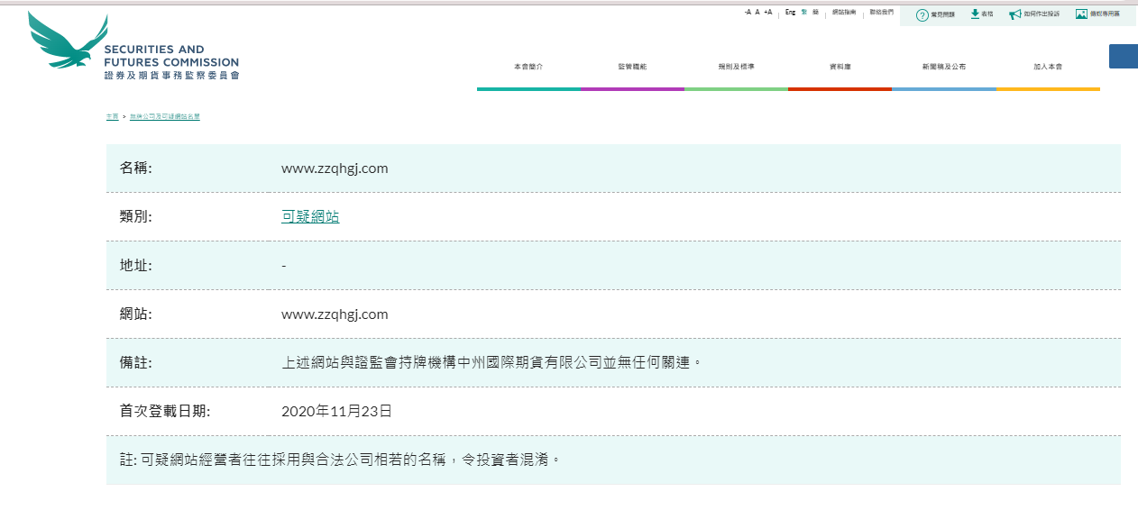 名称: www.zzqhgj.com 类别: 可疑网站地址: - 网站: www.zzqhgj.com 备注: 上述网站与证监会持牌机构 中州國際期货有限公司并无任何关连。首次登载日期: 2020年11月23日注: 可疑网站经营者往往采用与合法公司相若的名称,令投资者混淆。 " 无牌公司及可疑网站名单列出了没有在香港领取牌照,并引起了证监会关注的公司。这些公司被怀疑现正或曾经以香港投资者为推销对象,又或声称与香港有联系。 你可按名称或类别进行搜寻,以查证某公司是否已列入名单内。 此名单并非详尽无遗。由于证监会经常都会发现一些值得注意的公司或网站, 因此我们会不时在名单内加入新的名称。 若你曾经被无牌公司接触,请利用我们的网上投诉表格。 有关锅炉室,欺诈网站和伪冒电邮的进一步资料,请按相关连结。 注:无牌公司及可疑网站名单旨在及早向投资者发出警报。投资者不能只依赖上述名单的资料,他们需自行审慎查核个别公司的详情。 请选取各栏内容名称的首个英文字母以取览名单,或点击“中文名称”栏目浏览只具中文名称的公司。"