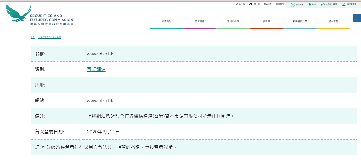 名称: www.jdzb.hk 类别: 可疑网站地址: - 网站: www.jdzb.hk 备注: 上述网站与证监会持牌机构建达(香港)资本市场有限公司并无任何关连。首次登载日期: 2020年9月21日注: 可疑网站经营者往往采用与合法公司相若的名称,令投资者混淆。 " 无牌公司及可疑网站名单列出了没有在香港领取牌照,并引起了证监会关注的公司。这些公司被怀疑现正或曾经以香港投资者为推销对象,又或声称与香港有联系。 你可按名称或类别进行搜寻,以查证某公司是否已列入名单内。 此名单并非详尽无遗。由于证监会经常都会发现一些值得注意的公司或网站, 因此我们会不时在名单内加入新的名称。 若你曾经被无牌公司接触,请利用我们的网上投诉表格。 有关锅炉室,欺诈网站和伪冒电邮的进一步资料,请按相关连结。 注:无牌公司及可疑网站名单旨在及早向投资者发出警报。投资者不能只依赖上述名单的资料,他们需自行审慎查核个别公司的详情。 请选取各栏内容名称的首个英文字母以取览名单,或点击“中文名称”栏目浏览只具中文名称的公司。"