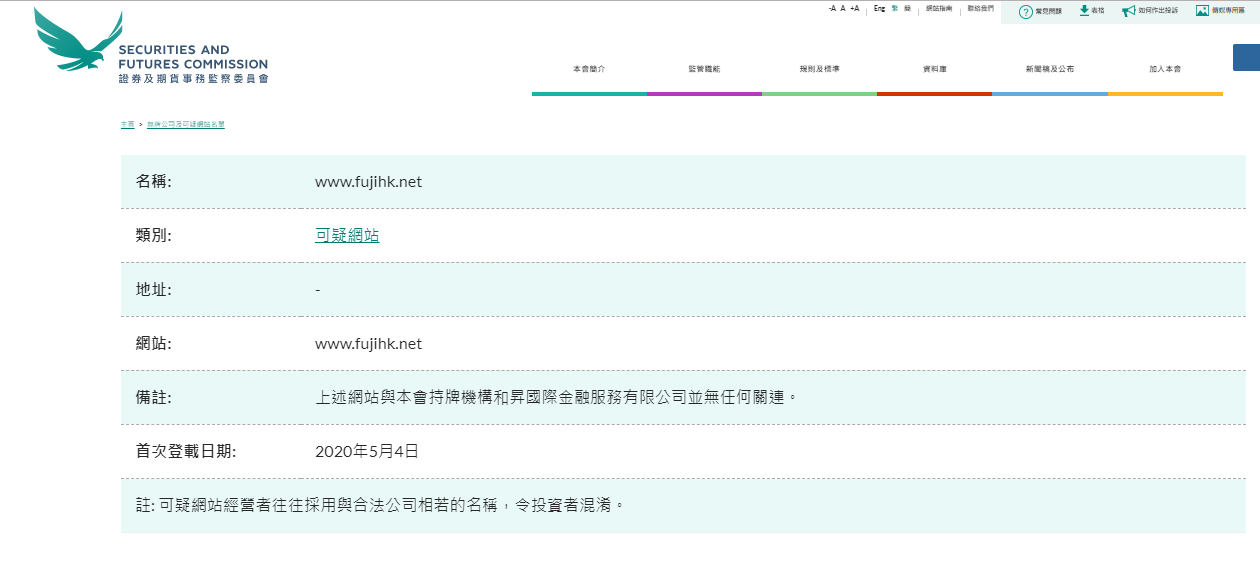名称: www.fujihk.net 类别: 可疑网站地址: - 网站: www.fujihk.net 备注: 上述网站与本会持牌机构和升国际金融服务有限公司并无任何关连。首次登载日期: 2020年5月4日注: 可疑网站经营者往往采用与合法公司相若的名称,令投资者混淆。 " 无牌公司及可疑网站名单列出了没有在香港领取牌照,并引起了证监会关注的公司。这些公司被怀疑现正或曾经以香港投资者为推销对象,又或声称与香港有联系。 你可按名称或类别进行搜寻,以查证某公司是否已列入名单内。 此名单并非详尽无遗。由于证监会经常都会发现一些值得注意的公司或网站, 因此我们会不时在名单内加入新的名称。 若你曾经被无牌公司接触,请利用我们的网上投诉表格。 有关锅炉室,欺诈网站和伪冒电邮的进一步资料,请按相关连结。 注:无牌公司及可疑网站名单旨在及早向投资者发出警报。投资者不能只依赖上述名单的资料,他们需自行审慎查核个别公司的详情。 请选取各栏内容名称的首个英文字母以取览名单,或点击“中文名称”栏目浏览只具中文名称的公司。"