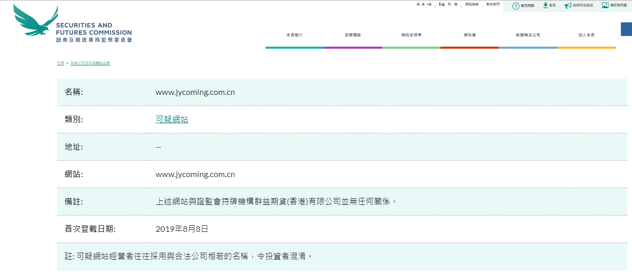 名称: www.jycoming.com.cn 类别: 可疑网站地址: -- 网站: www.jycoming.com.cn 备注: 上述网站与证监会持牌机构 群益期货(香港)有限公司并无任何关系。首次登载日期: 2019年8月8日注: 可疑网站经营者往往采用与合法公司相若的名称,令投资者混淆。 " 无牌公司及可疑网站名单列出了没有在香港领取牌照,并引起了证监会关注的公司。这些公司被怀疑现正或曾经以香港投资者为推销对象,又或声称与香港有联系。 你可按名称或类别进行搜寻,以查证某公司是否已列入名单内。 此名单并非详尽无遗。由于证监会经常都会发现一些值得注意的公司或网站, 因此我们会不时在名单内加入新的名称。 若你曾经被无牌公司接触,请利用我们的网上投诉表格。 有关锅炉室,欺诈网站和伪冒电邮的进一步资料,请按相关连结。 注:无牌公司及可疑网站名单旨在及早向投资者发出警报。投资者不能只依赖上述名单的资料,他们需自行审慎查核个别公司的详情。 请选取各栏内容名称的首个英文字母以取览名单,或点击“中文名称”栏目浏览只具中文名称的公司。"