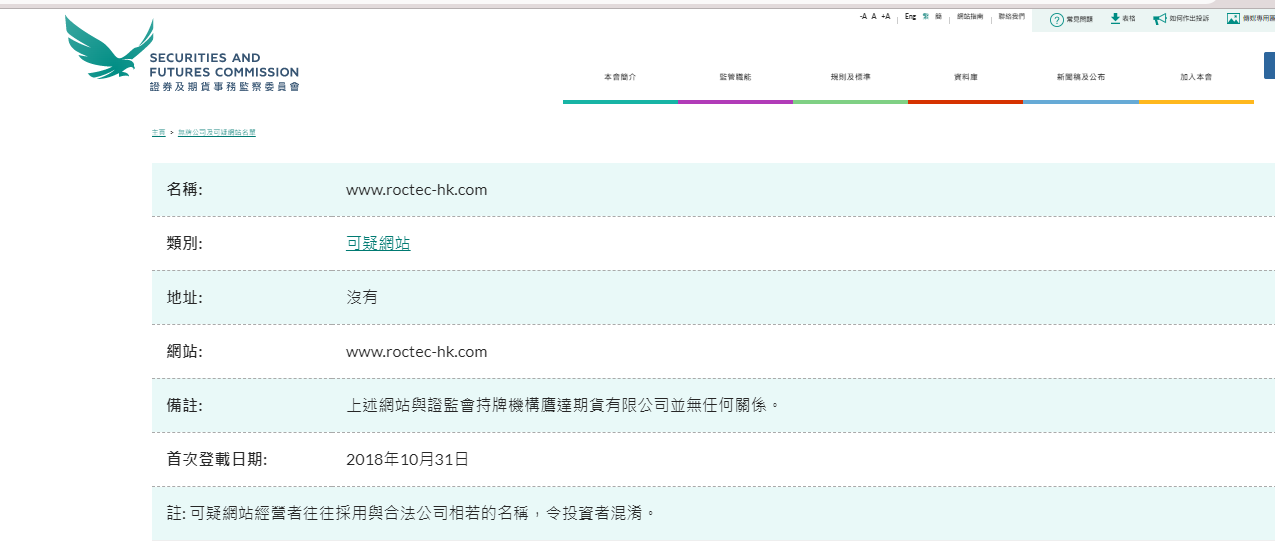 名称: www. 鹰达期货 -hk.com 类别: 可疑网站地址: 没有网站: www. 鹰达期货 -hk.com 备注: 上述网站与证监会持牌机构 鹰达期货有限公司并无任何关系。首次登载日期: 2018年10月31日注: 可疑网站经营者往往采用与合法公司相若的名称,令投资者混淆。 " 无牌公司及可疑网站名单列出了没有在香港领取牌照,并引起了证监会关注的公司。这些公司被怀疑现正或曾经以香港投资者为推销对象,又或声称与香港有联系。 你可按名称或类别进行搜寻,以查证某公司是否已列入名单内。 此名单并非详尽无遗。由于证监会经常都会发现一些值得注意的公司或网站, 因此我们会不时在名单内加入新的名称。 若你曾经被无牌公司接触,请利用我们的网上投诉表格。 有关锅炉室,欺诈网站和伪冒电邮的进一步资料,请按相关连结。 注:无牌公司及可疑网站名单旨在及早向投资者发出警报。投资者不能只依赖上述名单的资料,他们需自行审慎查核个别公司的详情。 请选取各栏内容名称的首个英文字母以取览名单,或点击“中文名称”栏目浏览只具中文名称的公司。"