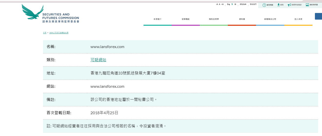 名称: www.lansforex.com 类别: 可疑网站地址: 香港九龙旺角道33号凯途发展大厦7楼04室网站: www.lansforex.com 备注: 该公司的香港地址属于一间秘书公司。首次登载日期: 2018年4月25日注: 可疑网站经营者往往采用与合法公司相若的名称,令投资者混淆。 " 无牌公司及可疑网站名单列出了没有在香港领取牌照,并引起了证监会关注的公司。这些公司被怀疑现正或曾经以香港投资者为推销对象,又或声称与香港有联系。 你可按名称或类别进行搜寻,以查证某公司是否已列入名单内。 此名单并非详尽无遗。由于证监会经常都会发现一些值得注意的公司或网站, 因此我们会不时在名单内加入新的名称。 若你曾经被无牌公司接触,请利用我们的网上投诉表格。 有关锅炉室,欺诈网站和伪冒电邮的进一步资料,请按相关连结。 注:无牌公司及可疑网站名单旨在及早向投资者发出警报。投资者不能只依赖上述名单的资料,他们需自行审慎查核个别公司的详情。 请选取各栏内容名称的首个英文字母以取览名单,或点击“中文名称”栏目浏览只具中文名称的公司。"