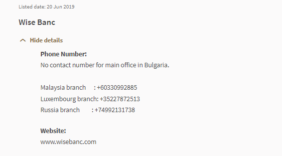 “投资者警示名单 投资者警示名单提供了一份名单,根据 MAS 可获得的信息,这些人员:i) 可能或可能被错误地认为是获得许可或以任何其他方式由 Mas 授权或监管的;ii) 已经做出商业信托或集体投资计划中的单位要约可能被或可能被错误地认为是经 MAS 授权、认可或注册的;iii) 已做出可能或可能被错误地认为是的投资要约在向 mas 提交或注册的文件中制作或附有该文件。此清单并非详尽无遗,而是基于 mas 在发布时所知的内容。上市日期:2019-06-20 WISE BANC隐藏详细信息 电话号码:没有保加利亚总公司的联系电话。马来西亚分行:+60330992885 卢森堡分行:+35227872513 俄罗斯分行:+74992131738 网站:www.wisebanc.com