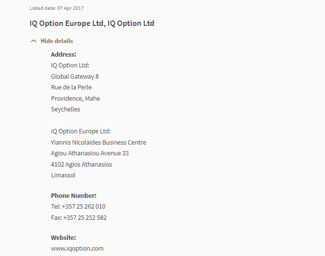 “投资者警示名单 投资者警示名单提供了一份名单,根据 MAS 可获得的信息,这些人员:i) 可能或可能被错误地认为是获得许可或以任何其他方式由 Mas 授权或监管的;ii) 已经做出商业信托或集体投资计划中的单位要约可能被或可能被错误地认为是经 MAS 授权、认可或注册的;iii) 已做出可能或可能被错误地认为是的投资要约在向 mas 提交或注册的文件中制作或附有该文件。此清单并非详尽无遗,而是基于 mas 在发布时所知的内容。上市日期:2017-04-07 IQ Option欧洲有限公司, IQ Option有限公司隐藏详情地址: IQ Option有限公司:全球门户 8 rue de la perle providence, mahe seychelles IQ Option欧洲有限公司:yiannis nicolaides business center agiou athanasiou avenue 33 4102 agios athanasios limassol 电话号码:电话:+357 25 262 010 传真:+357 25 252 582 网站:www.iqoption.com