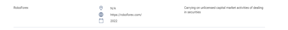 “本节包含未经授权的网站、投资产品、公司和个人的清单。该清单包括:未经 SC 许可而从事或自称从事以下受监管活动的人:证券交易;衍生品交易;基金管理;就企业融资提供建议;投资建议;财务规划;以及私人退休计划交易。未经授权经营公认市场的人。未经批准、授权或认可发行或发行证券的人。滥用 sc 的徽标和歪曲 sc 的人。 “ Roboforex不适用 https:// Roboforex .com/ 2022 进行无证证券交易的资本市场活动