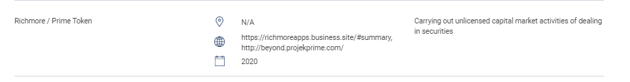 “本节包含未经授权的网站、投资产品、公司和个人的清单。该清单包括:未经 SC 许可而从事或自称从事以下受监管活动的人:证券交易;衍生品交易;基金管理; 就公司财务提供建议; 投资建议; 财务规划;以及 私人退休计划交易 未经授权经营公认市场的人 未经批准、授权或认可发行或发行证券的人 滥用 SC 的标识和歪曲 SC 的人。 " Richmore / Prime Token N/A https://richmoreapps.business.site/#summary, http://beyond.projekprime.com/ 2020 年进行未经许可的证券交易资本市场活动