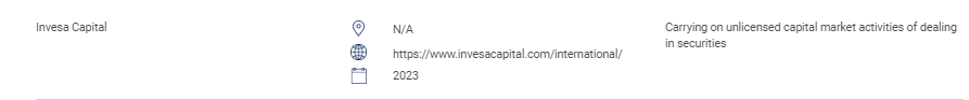 “本节包含未经授权的网站、投资产品、公司和个人的清单。该清单包括:未经 SC 许可而从事或自称从事以下受监管活动的人:证券交易;衍生品交易;基金管理;就企业融资提供建议;投资建议;财务规划;以及私人退休计划交易。未经授权经营公认市场的人。未经批准、授权或认可发行或发行证券的人。滥用 sc 的徽标和歪曲 sc 的人。 " invesa capital n/a https://www. InvesaCapital .com/international/ 2023 进行无证证券交易的资本市场活动