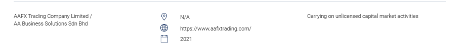 "本节包含未经授权的网站、投资产品、公司和个人的清单。该清单包括:未经证券委员会许可进行或自称进行以下受监管活动的人员:证券交易;衍生品交易;基金管理;就公司财务提供建议;投资建议;财务规划;以及从事私人退休计划的交易。 ” AAFX贸易有限公司 / aa Business Solutions sdn bhd 不适用 https://www. AAFX Trading.com/ 2021 进行未经许可的资本市场活动