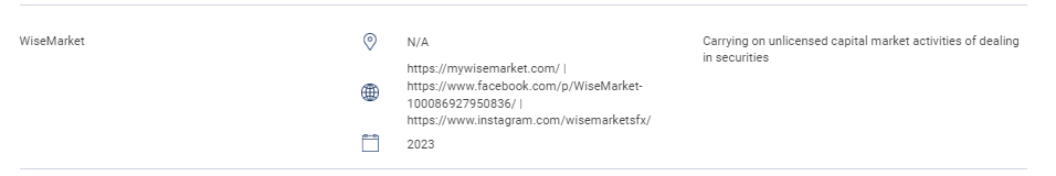 "本节包含未经授权的网站、投资产品、公司和个人的清单。该清单包括:未经证券委员会许可进行或自称进行以下受监管活动的人员:证券交易;衍生品交易;基金管理;就公司财务提供建议;投资建议;财务规划;以及从事私人退休计划的交易。 ” WISEMARKET不适用 https://我的 WISEMARKET.com/ | https://www.facebook.com/p/ WISEMARKET -100086927950836/ | https://www.instagram.com/ WISEMARKET sfx/2023 进行未经许可的资本市场证券交易活动