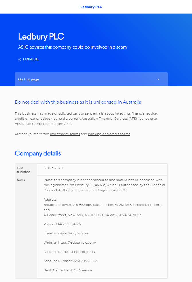 Ledburyplc asic 建议该公司可能涉及诈骗 页面阅读时间:本页面 1 分钟 不要与该企业打交道,因为该企业在澳大利亚未经许可 该企业已主动拨打电话或发送有关投资、财务建议、信贷或贷款的电子邮件。它不持有当前的澳大利亚金融服务(AFS)许可证或澳大利亚证券投资委员会(ASIC)颁发的澳大利亚信贷许可证。保护自己免受投资诈骗以及银行和信贷诈骗。公司详细信息首次发布于 2020 年 6 月 17 日注释(注:该公司与合法公司没有关联,且不应与合法公司混淆) Ledbury sicav plc,由英国金融行为监管局授权,#783591) 地址:broadgate tower, 201 bishopsgate, london, ec2m 3ab, United Kingdom; 40 wall street, new york, ny, 10005, usa 电话:+81 3 4578 9022 电话:+44 2039174307 电子邮件:info@ Ledbury plc.com 网站:https:// Ledbury plc.com/ 账户名称:lj Composites llc 帐号:3251 2043 8884 银行名称:bank of america