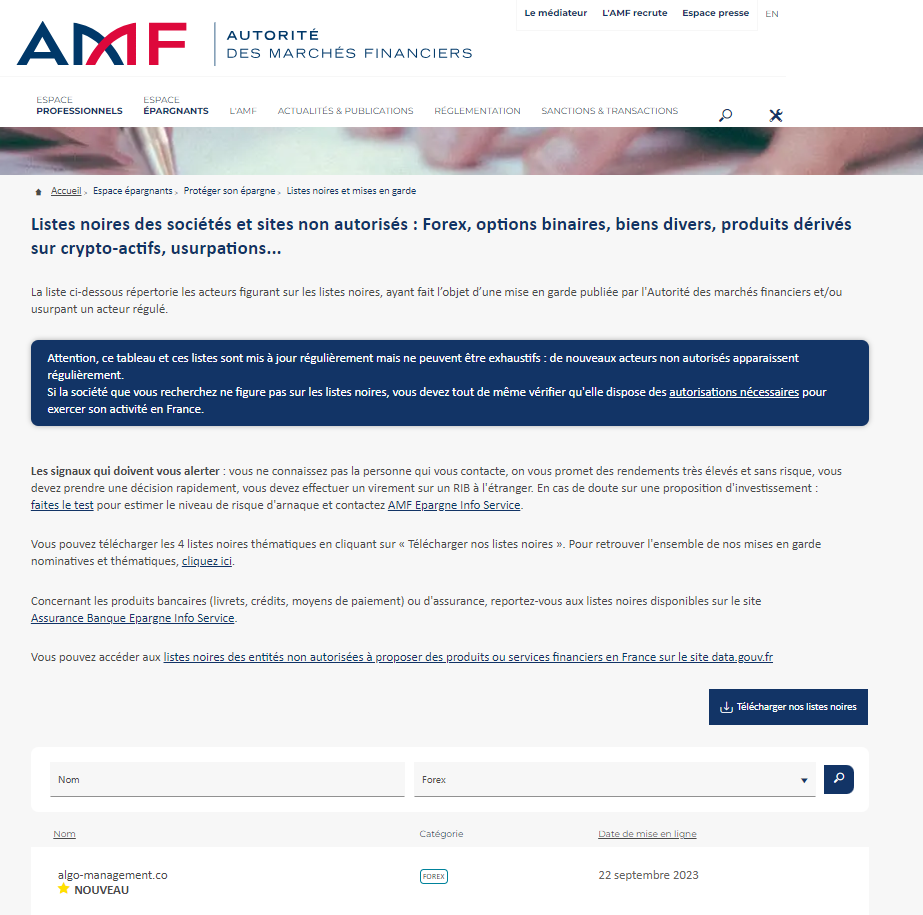 这是金融市场管理局 (AMF) 列入黑名单的公司或网站、对受监管公司的警告和/或篡夺的列表。